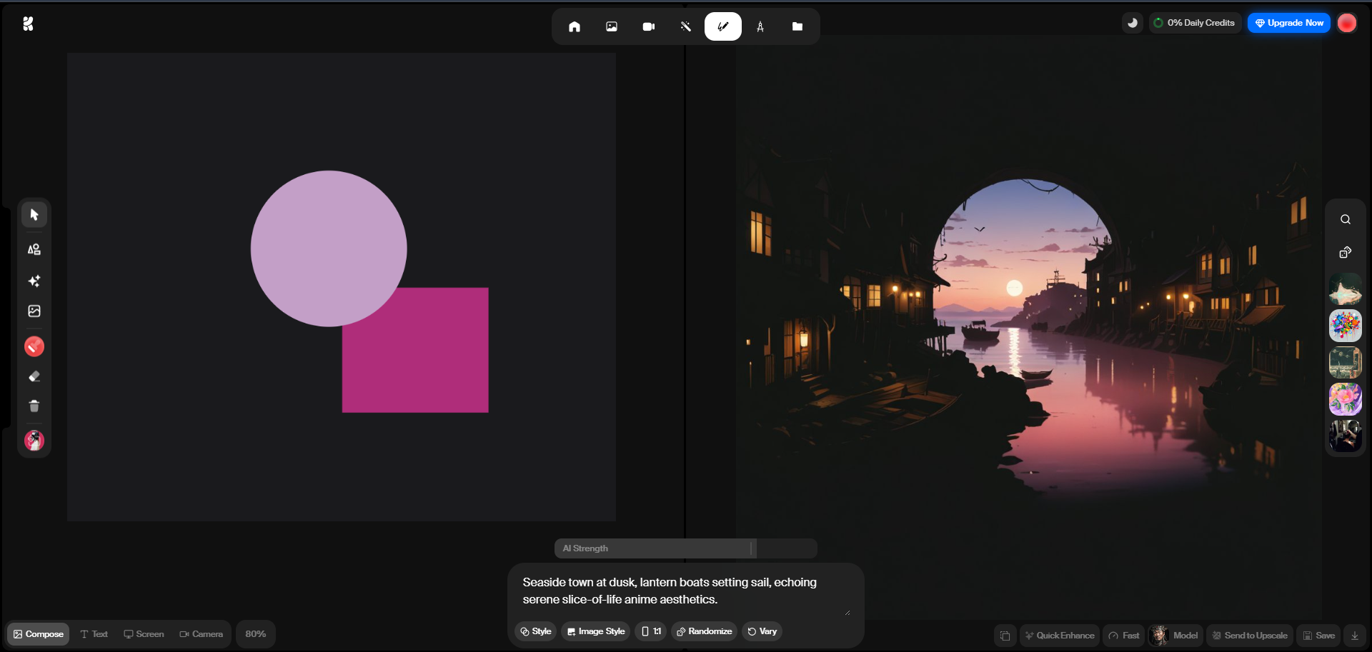 این یکی از هیجانانگیزترین بخشهای Krea است. تصور کنید دارید یک دستور متنی (پرامپت) مینویسید و همزمان، تصویر جلوی چشمانتان در حال تغییر و شکل گرفتن است. انگار دارید با هوش مصنوعی گپ میزنید و او همان لحظه ایدههایتان را نقاشی میکند! این ویژگی به شما اجازه میدهد: